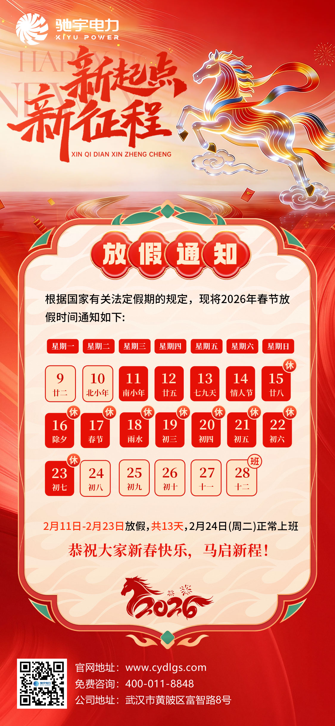 馬踏祥云馱福至,春臨大地報喜來。2025年乙已蛇年即將成為過去,我們即將開啟充滿新希望、新機遇的丙午馬年。根據(jù)《國務(wù)院辦公廳關(guān)于2026年部分節(jié)假日安排的通知》,結(jié)合我公司實際情況,現(xiàn)將春節(jié)放假安排的有關(guān)事宜通知如下: